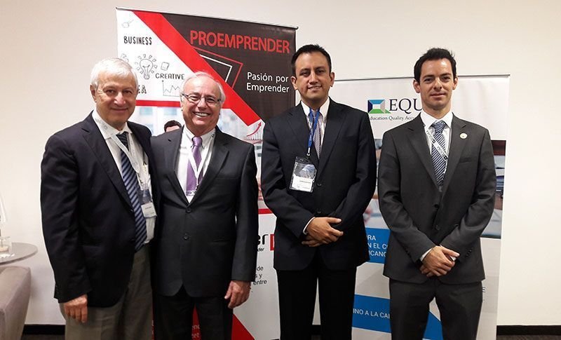Universidad ESAN presente en el Primer Encuentro Internacional entre Centros de Emprendimiento Universitarios y el sector empresarial vinculado a la innovación. En la foto: De izq. a der.: Antonio Freitas, Presidente de EQUAA; Jorge Talavera, Rector de la Universidad ESAN; Guillermo Quintana, Director de Proemprender; y Eric Talavera, Director Ejecutivo de EQUAA.